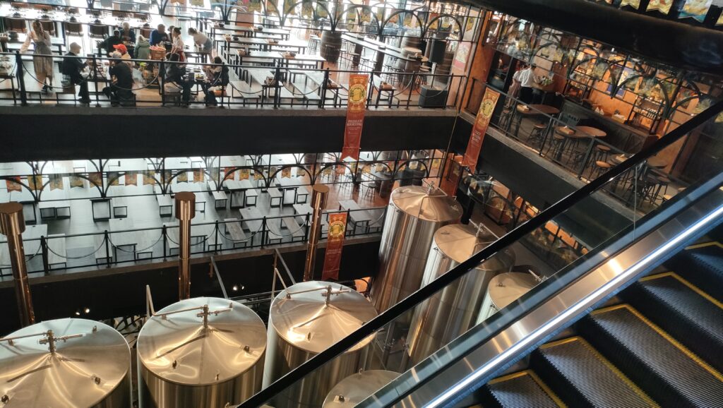 エスカレーターを下ると、たくさんの醸造タンクと、にぎやかなビアレストランがお目見え。