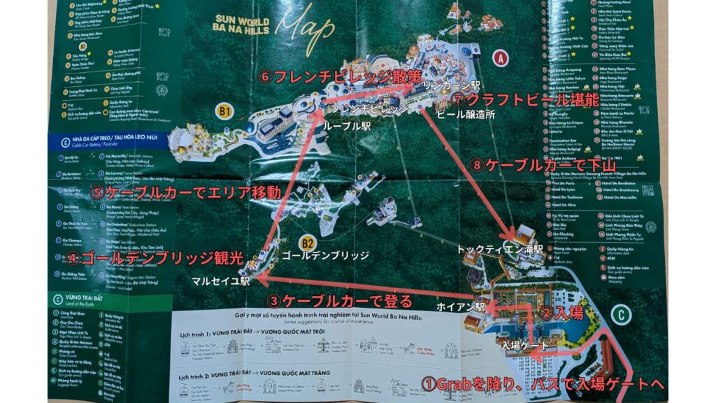 「ロープウェイで登る → ゴールデンブリッジを渡る → ロープウェイで移動 → フレンチビレッジ散策 → ビール醸造所で名物クラフトビールを味わう → ロープウェイで下山」