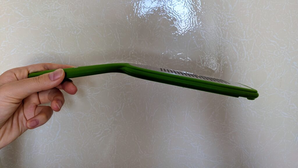 ちょうどいい角度がついているので、お皿やジップロック内で立てて使う時も、ボウルに上から載せて横向きに使う時も、変に力まなくてもおろせるのがイイ!